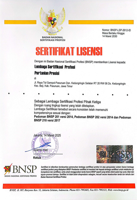 Lembaga Sertifikasi Profesi (LSP) Pertanian Presisi, yang terdaftar sebagai Lembaga Sertifikasi Profesi Pihak Ketiga dengan nomor registrasi BNSP-LSP-2012-ID, memiliki masa berlaku hingga 14 Maret 2030. LSP Pertanian Presisi secara konsisten telah memenuhi standar kompetensi yang ditetapkan sesuai dengan Pedoman BNSP 201 edisi 2014, Pedoman BNSP 202 edisi 2014, serta Pedoman BNSP 201 edisi 2017.